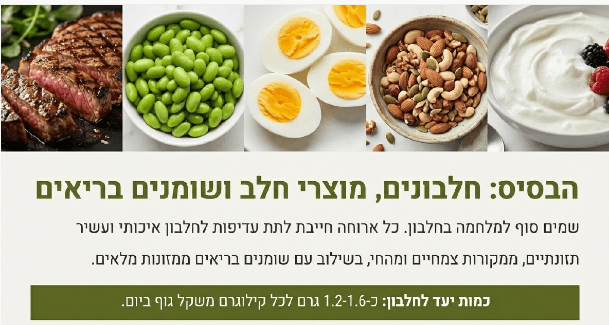 חלבון איכותי עומד בבסיס התזונה. כל ארוחה אמורה לכלול מקור חלבוני משמעותי התורם לשובע, לשימור מסת שריר ולבריאות מטבולית.